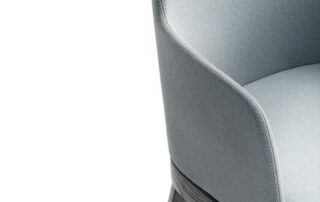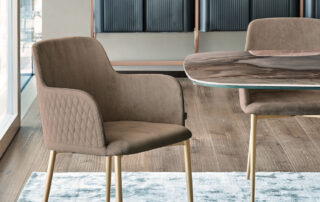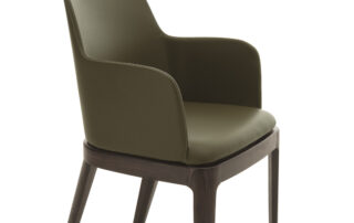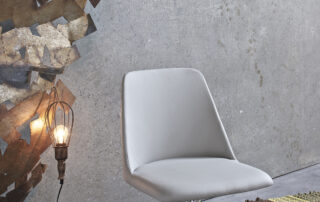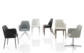 Chaise avec ou sans accourdoirs, structure en bois massif ou en métal laqué, pivotante 4 pieds ou un pied central en métal chromé. Coque rembourrée et revêtue. Aussi disponible avec le revêtement du dossier matelassé.