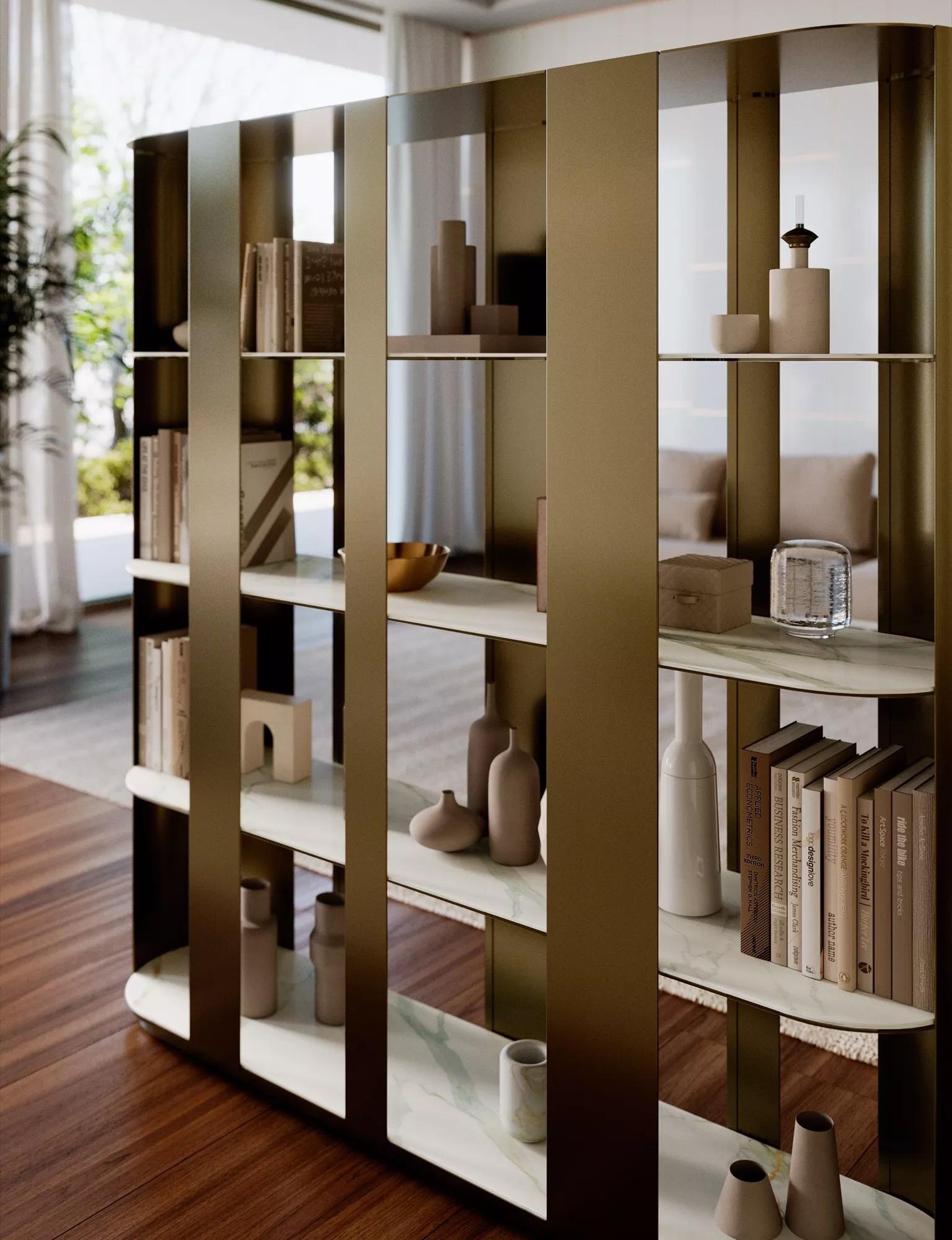 La bibliothèque Helena est une micro-architecture domestique : un objet qui divise, connecte et raconte. Sa base ovale, fluide et organique, rompt avec la rigidité du concept traditionnel de bibliothèque. Les colonnes porteuses décalées, disposées dans un jeu élégant de pleins et de vides entre l’avant et l’arrière, créent des perspectives, des filtres visuels, des décors. Certains objets se révèlent, d’autres se dissimulent – non par hasard, mais par choix de design. Le regard est guidé à travers une géométrie variable, qui change selon la position de l’observateur et la lumière qui danse entre les étagères. Idéale en version autoportante comme séparation sculpturale, ou en version murale comme élément fonctionnel structurant l’espace