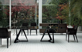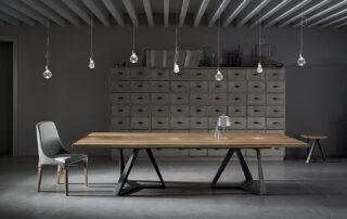 Table fixe, structure en métal laqué. Plateau en bois plaqué, bois plaqué avec bords en bois massif, bois massif, bois centenaire massif, Verre ou SuperMarbree.